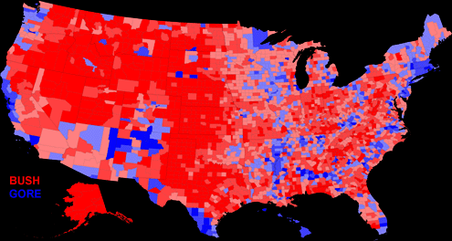 The most obvious argument for why George W. should have never become president is the simple numbers. Look at the official and final tally numbers taken straight from the U.S. government site that are displayed in the table above. Gore received more than 500,000 more votes than Bush did. More than an entire half percent! I understand the electoral college system and some of the benefits it has, however it clearly failed us here. Flat out, no argument about it... Gore won the popular vote. More voters voted for Gore than Bush. All sides agree on this fact. Looking at the map above, you might be thinking to yourself, "Just LOOK at all the red in that picture!" Well, true, at first glance, it appears that Bush just trounced Gore. But take a step back for a moment, and look harder. Notice how all the blue lies on the coasts and around the major metropolitan areas of the country? "So cities are more liberal than the heartland. Well, what's new?" Herein lies my point: I challenge anyone to disagree that, for the most part, the most educated, sophisticated, and progressive people generally flock to and live in urban areas. Am I wrong? Is that not true? I've had people tell me they hate when people generalize farm-country dwellers as unsophisticated hillbillies. They say, "I know lots of smart people who came from the heartland." Well, I believe you, but consider this: you met them here in California! Yes, I'm sure they are smart and progressive-minded... that's why they left the heartland and came here! This is where smart people live! The Democratic strongholds are generally dense and focussed in urban areas. The reports of the 2000 election pointed out that most of the states Bush won, he won by a small margin. The ones Gore won, he generally cleaned up in. So what should that tell you? It should tell you that Bush won because his support comes from a weak majority across a lot of sparsely populated states. Gore won the popular vote nation-wide, but many of those votes happened to come from a few, dense states. So what is democracy? It's ruling for, of, and by the people, right? Bush won because his (fewer) votes were spread across more land, no? Who gives a crap about what state the votes came from? Democracy is supposed to based on the will of the people, regardless of what state they live in! One person, one vote, right? WRONG. Check out this excerpt from FairVote.org: